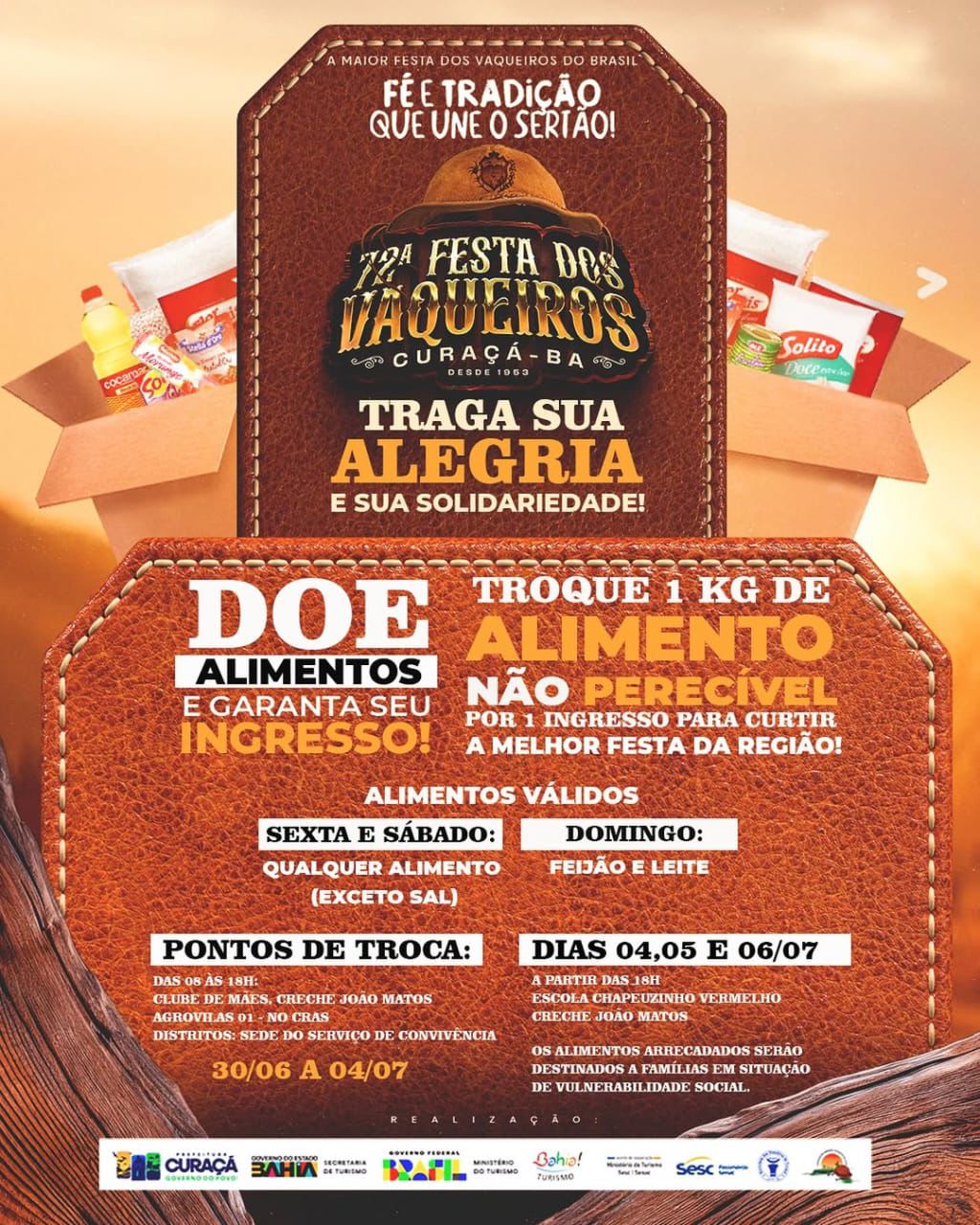 Chegou a hora! A cidade de Curaçá vive está vivenciando a emoção da 72ª edição da Festa dos Vaqueiros, um dos eventos mais tradicionais e aguardados do Sertão baiano. Mais que festa, é um verdadeiro ato de solidariedade: a entrada para curtir os shows e celebrações pode ser garantida com a doação de 1 kg de alimento não perecível, que será destinado a famílias em situação de vulnerabilidade social.