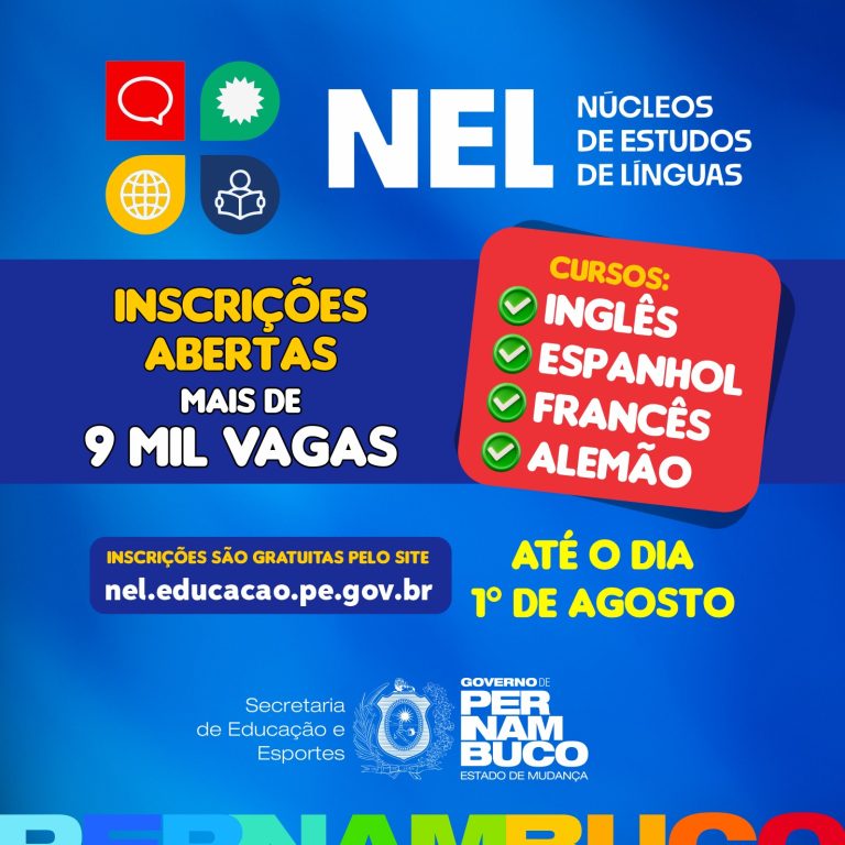 A Secretaria de Educação de Pernambuco abriu nesta sexta-feira (4) as inscrições para os cursos gratuitos de idiomas oferecidos pelos Núcleos de Estudos de Línguas (NEL) em várias regiões do estado. São mais de 9 mil vagas disponíveis para crianças de 8 a 12 anos no nível infantil e para pessoas a partir de 14 anos, no nível básico iniciante, que possuam CPF.