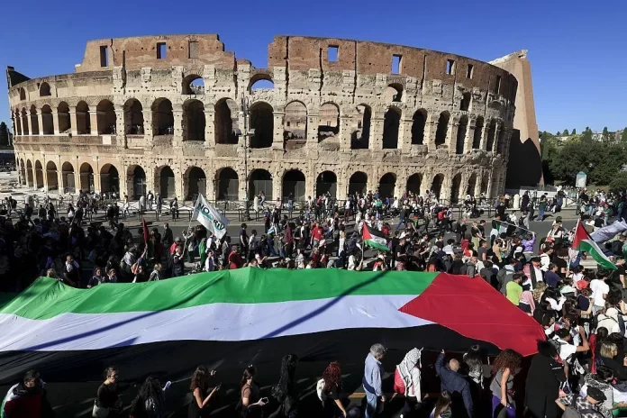 Na Itália, a onda de protestos chegou ao quarto dia consecutivo. Na capital Italiana, Roma, pessoas tomaram as ruas com faixas e bandeiras gritando “Palestina Livre”, em uma marcha que, segundo organizadores, atraiu mais de 1 milhão de pessoas, enquanto a polícia estimou 250 mil participantes.