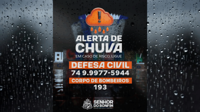 A Prefeitura de Senhor do Bonfim emitiu um alerta à população sobre a previsão de chuvas intensas nas próximas horas. Segundo o INMET (Instituto Nacional de Meteorologia), há risco de precipitações de 20 a 30 mm por hora, com possibilidade de acumular até 50 mm no dia, além de ventos fortes de 40 a 60 km/h.