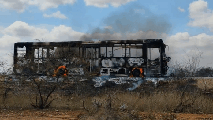 Um ônibus da linha intermunicipal Juazeiro–Sobradinho pegou fogo na manhã desta quinta-feira (04) perto da comunidade de Planalto, no Salitre. O veículo, da empresa JL Transportes, transportava passageiros quando as chamas começaram, causando pânico.