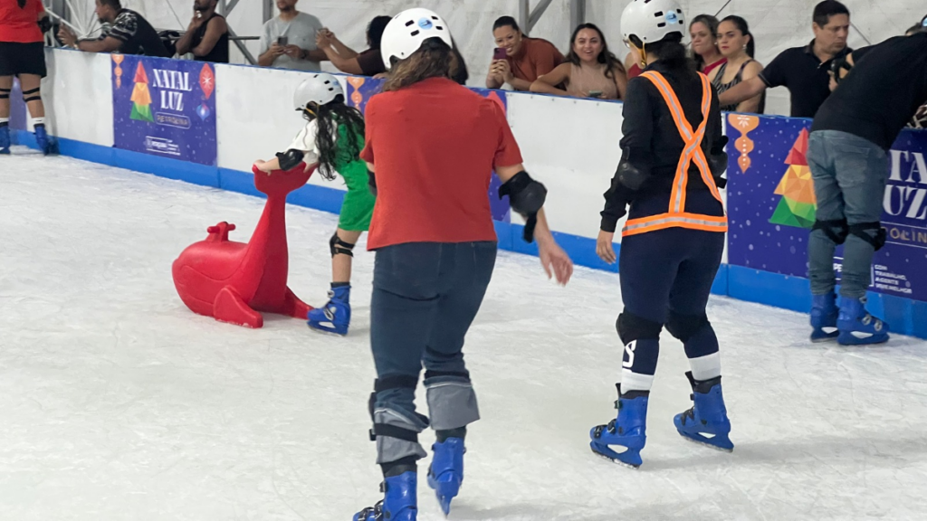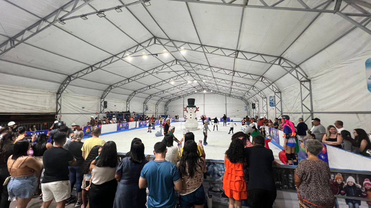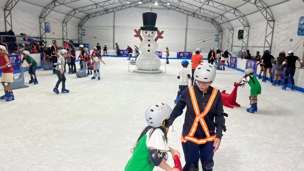 Montada em uma área de grande circulação, a pista opera com sessões organizadas ao longo do dia e controle de acesso para garantir mais espaço entre os usuários. A proposta é oferecer uma experiência segura, principalmente para quem nunca teve contato com a patinação no gelo, reduzindo o número de pessoas simultaneamente na área de gelo.