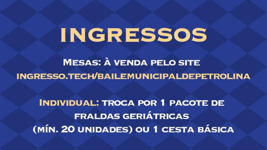 Os ingressos podem ser adquiridos em duas modalidades. Mesas para até quatro pessoas estão à venda por R$ 330,00, com taxa de conveniência de 10% cobrada no momento da compra pelo site ingresso.tech/bailemunicipaldepetrolina. As mesas são limitadas e devem ser compradas antecipadamente.