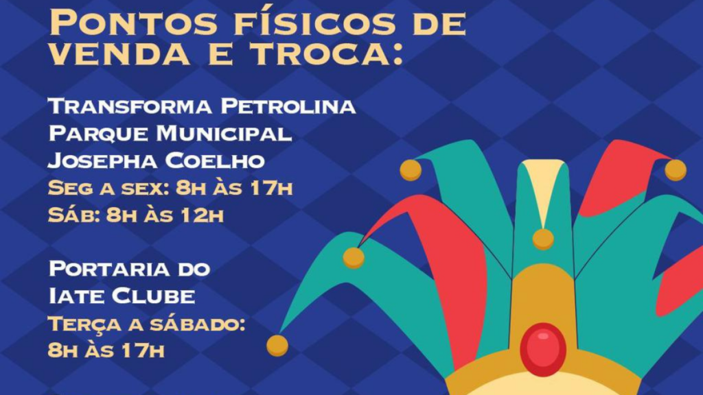 Além da compra online, os ingressos individuais podem ser trocados em pontos físicos: no Transforma Petrolina, no Parque Municipal Josepha Coelho, de segunda a sexta, das 8h às 17h, e aos sábados, das 8h às 12h; na portaria do Iate Clube, de terça a sábado, das 8h às 17h; e na Secretaria de Desenvolvimento Econômico, Turismo e Inovação, na Avenida Clementino Coelho, nº 714, Parque Bandeirantes, de segunda a sexta, das 8h às 13h.