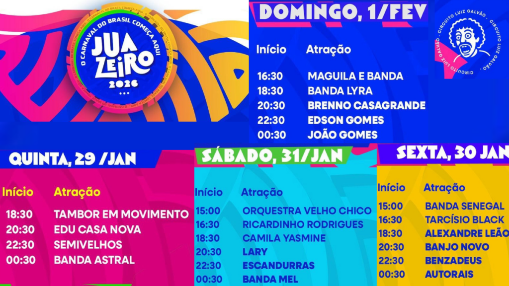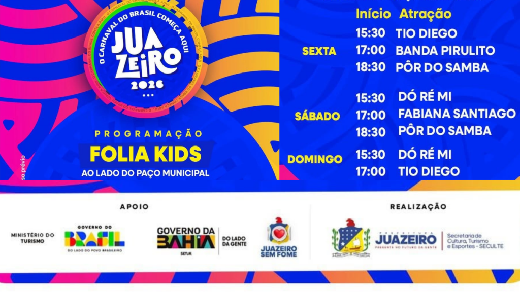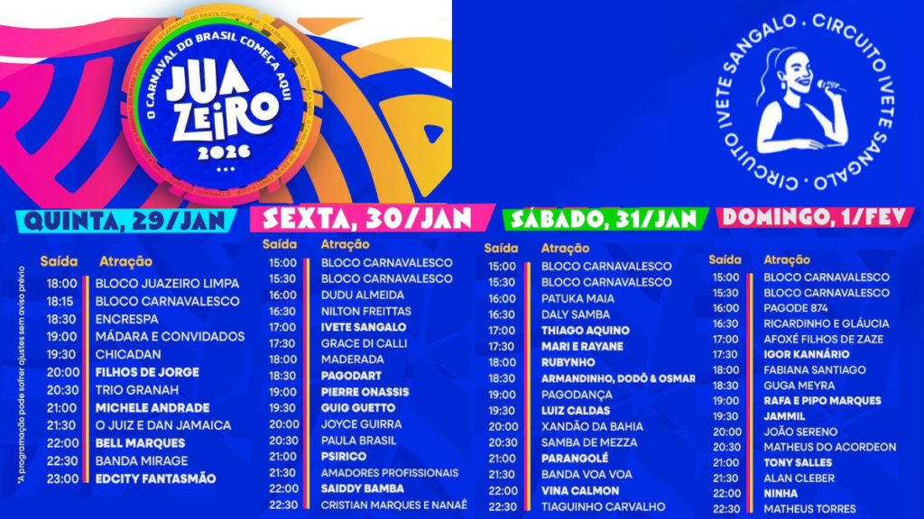 Juazeiro anunciou a programação oficial do Circuito Ivete Sangalo para o Carnaval 2026, com mais de 50 atrações distribuídas entre a Avenida Adolfo Viana e a Orla I. Entre os nomes confirmados estão Ivete Sangalo, Bell Marques, Igor Kannário, Psirico, Parangolé, Jammil, Luiz Caldas, Armandinho, Rafa e Pipo Marques.