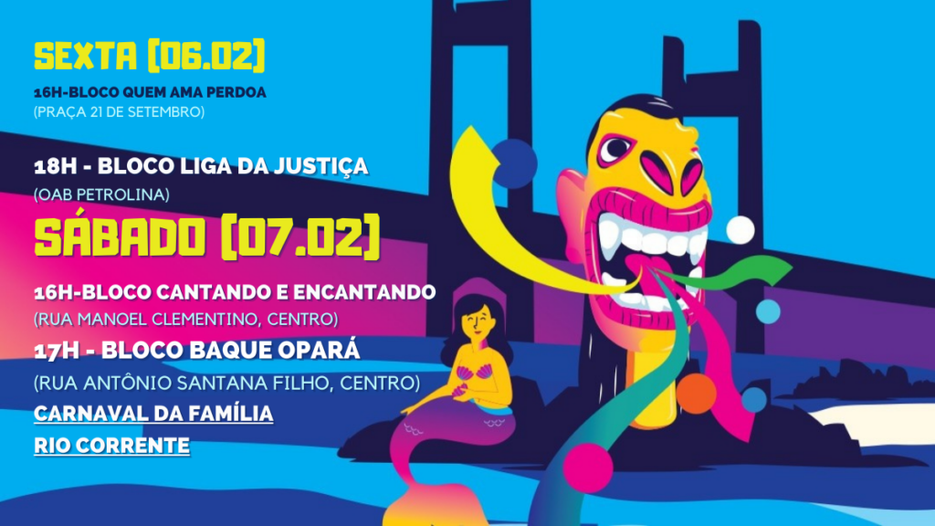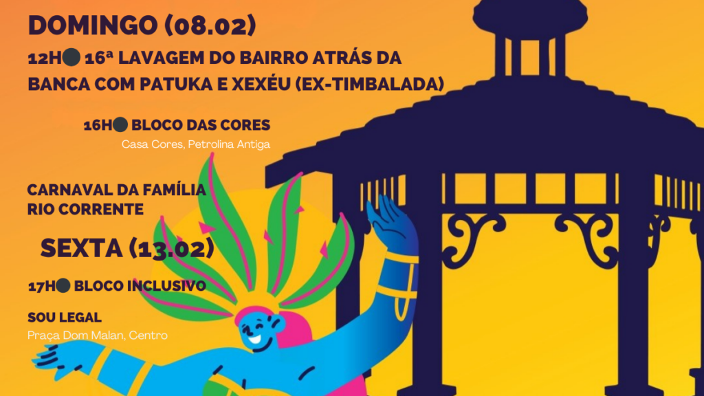 No domingo (08), acontece a 16ª Lavagem do Bairro Atrás da Banca, a partir das 12h, com Patuka e Xexéu. Às 16h, o Bloco das Cores anima a Casa Cores, na Petrolina Antiga. Já na sexta-feira (13), o Carnaval da Família Rio Corrente promove o Bloco Inclusivo Sou Legal, às 17h, na Praça Dom Malan.