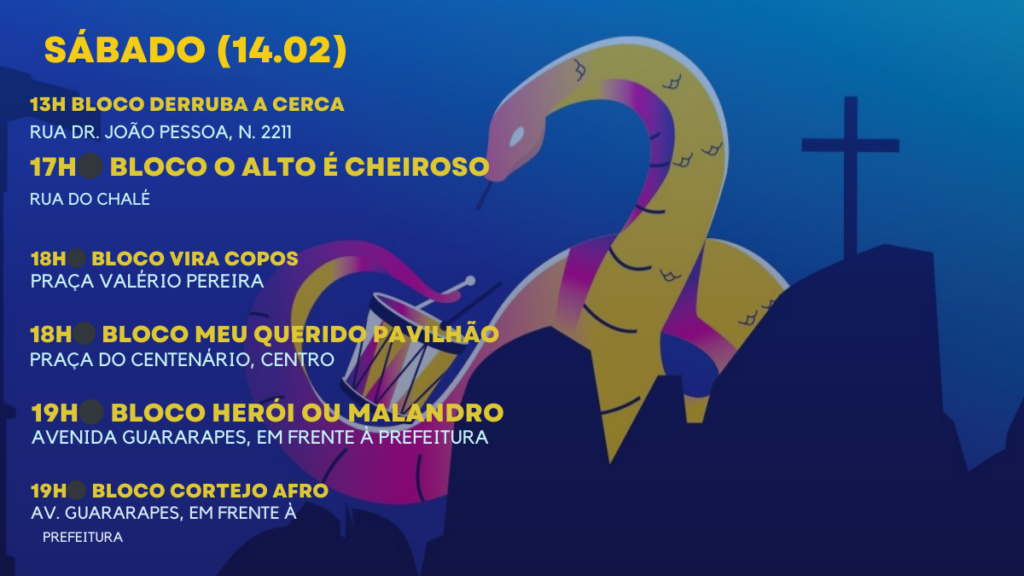 A programação principal começa no sábado (14). Às 13h, sai o Bloco Derruba a Cerca, na Rua Dr. João Pessoa.