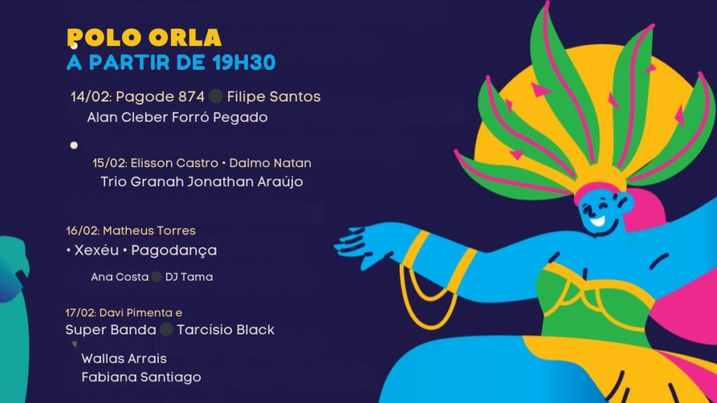 No Polo Orla, também de 14 a 17 de fevereiro, sobem ao palco artistas como Pagode 874, Filipe Santos, Alan Cleber, Forró Pegado, Elisson Castro, Dalmo Natan, Trio Granah, Jonathan Araújo, Matheus Torres, Xexéu, Pagodança, Ana Costa, Tarcísio Black, Wallas Arrais e Fabiana Santiago.