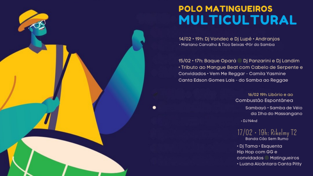 Além dos blocos, três polos concentram os shows do Carnaval. No Polo Matingueiros Multicultural, a programação acontece de 14 a 17 de fevereiro, reunindo DJs, bandas locais, atrações de reggae, samba, hip hop e mangue beat.