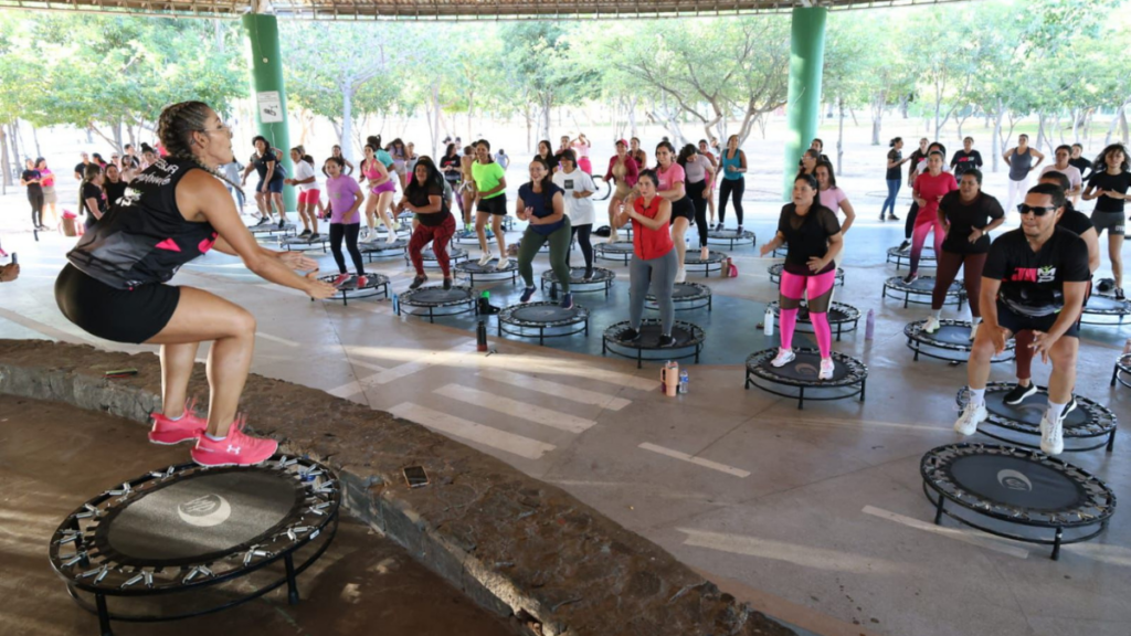 Durante a ação, profissionais de educação física conduziram a aula e orientaram as participantes na execução dos movimentos realizados com o uso de mini trampolins. O exercício aeróbico, marcado por música e ritmo intenso, contribuiu para melhorar o condicionamento físico, fortalecer a musculatura e desenvolver a coordenação motora das participantes.