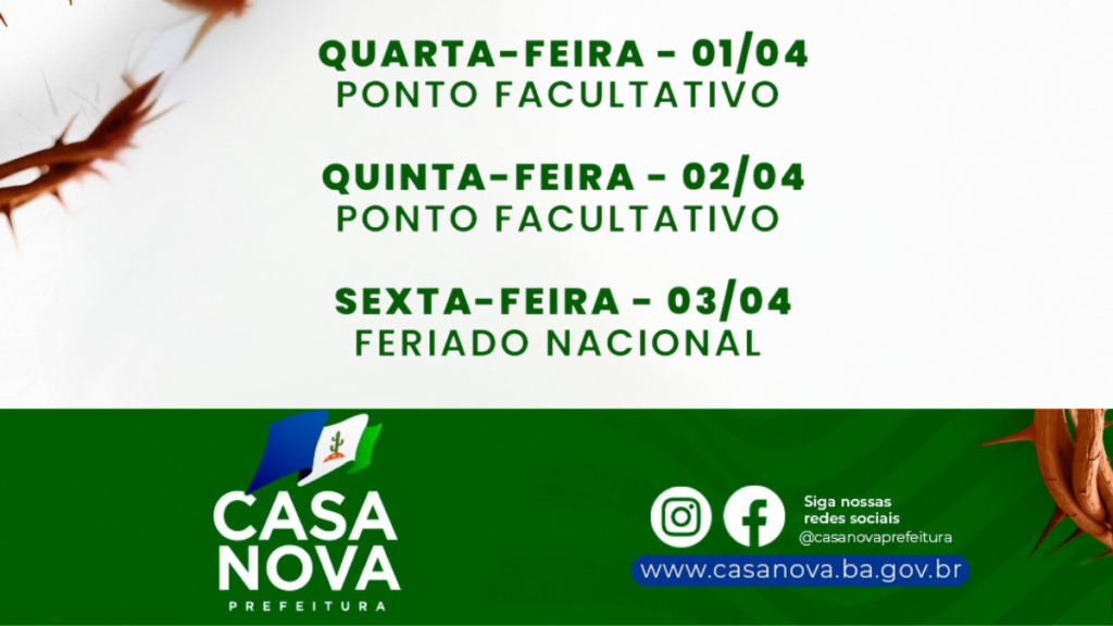 A Prefeitura de Casa Nova estabeleceu ponto facultativo nos dias 1º e 2 de abril para os órgãos e entidades da Administração Pública Municipal direta, autárquica e fundacional. A medida foi oficializada por meio da Portaria nº 003/2026 e leva em consideração as celebrações da Semana Santa, além do feriado nacional da Sexta-feira Santa, em 3 de abril.