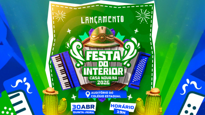 A Prefeitura de Casa Nova vai apresentar oficialmente, nesta quarta-feira (30), a edição 2026 da Festa do Interior. O lançamento acontece às 19h, no auditório do Colégio Estadual do município, em uma noite que antecede o feriado do Dia do Trabalhador.