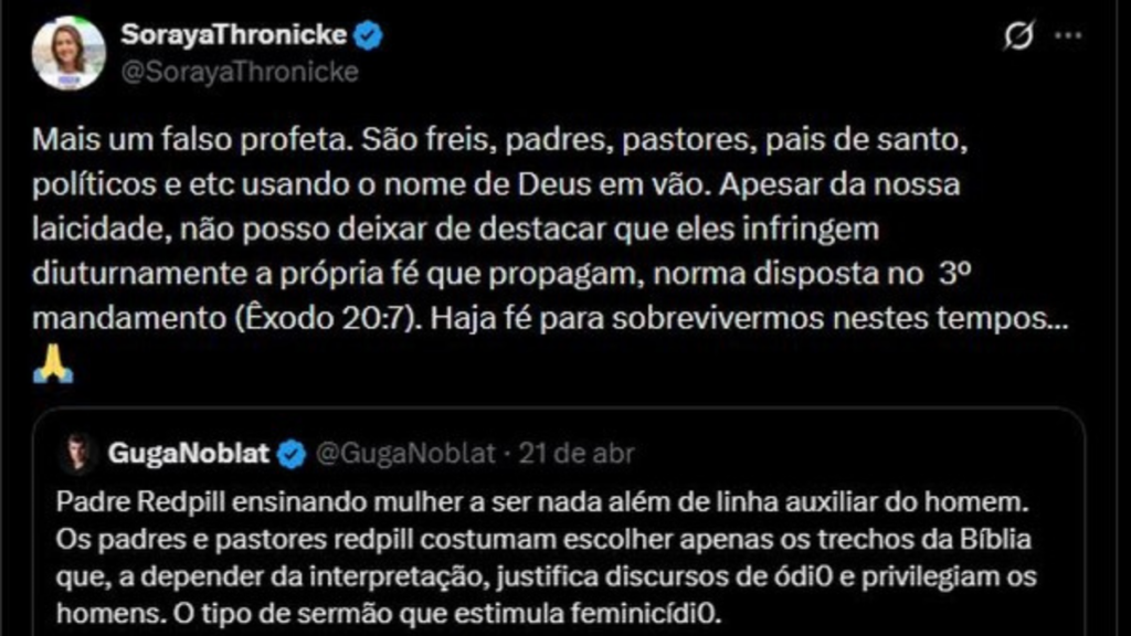 O caso ganhou ainda mais visibilidade após a senadora Soraya Thronicke se manifestar publicamente, reprovando o teor das declarações e classificando o conteúdo como incompatível com a igualdade de gênero.