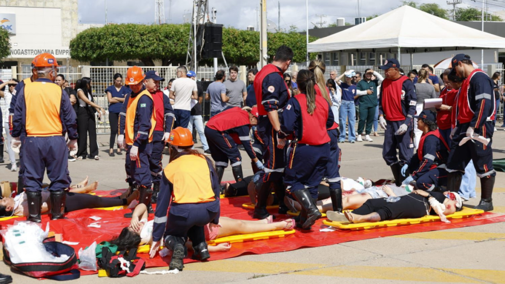 Ao todo, cerca de 150 profissionais participaram da ação, atuando de forma integrada no resgate das vítimas, triagem e encaminhamento para atendimento pré-hospitalar, com classificação por cores conforme a gravidade.